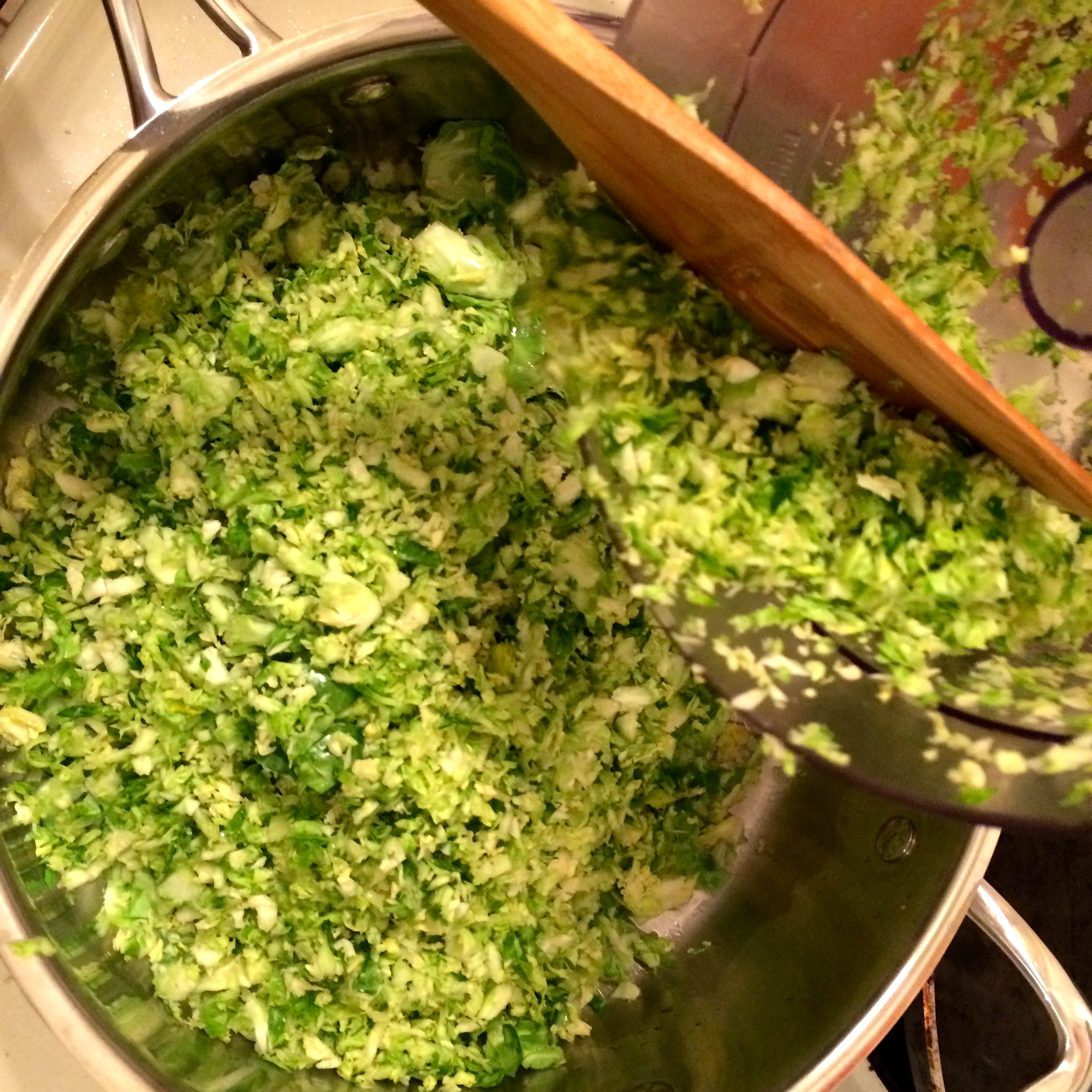 Step 3 – Heat a skillet and sauté the garlic and 2 TBSP ghee. Add the chopped brussel sprouts and sauté together.