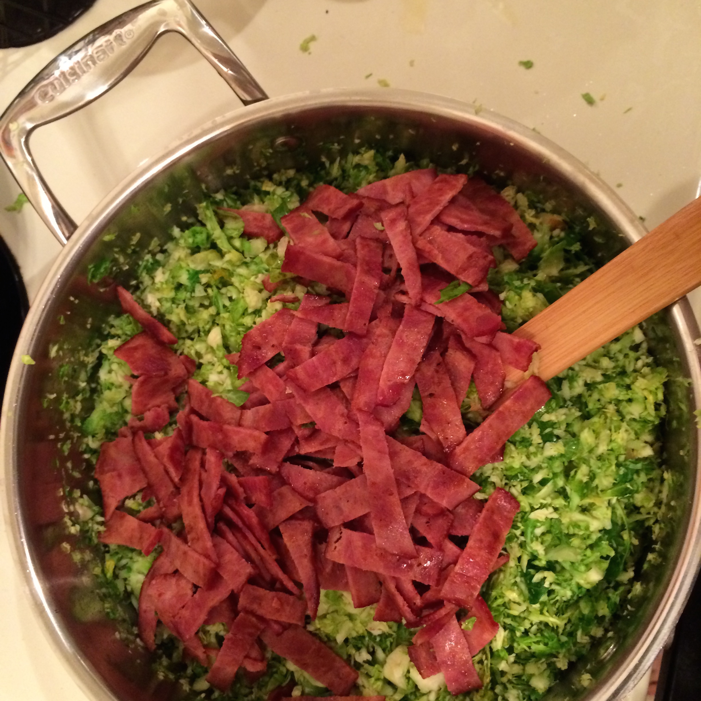 Step 4 – Add the bacon to the sauté and cook until the brussel sprouts are softened (about 5 minutes). Remove from heat and set aside.